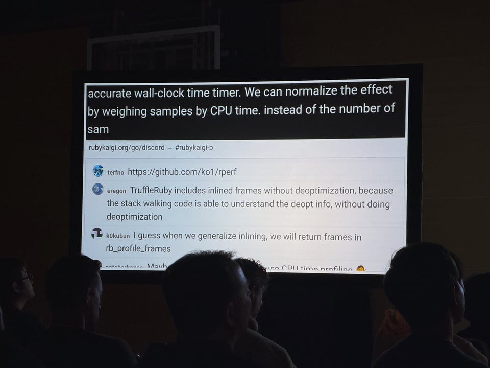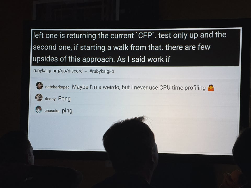 The folks who work on profilers always seem to attend RubyKaigi. John Hawthorn, Ivo Anjo, and Daisuke Aritomo were all presenting this year. Daisuke Aritomo was presenting on CPU profiling, which is more relevant than ever with the improvements to Ractors.
